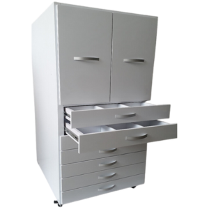 8 cajones horizontales con subdivisiones, puertas en polivinil blanco y manijas en acero inoxidable ref.304.