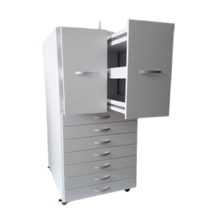 Fabricado en lámina de acero cold rolled C.22. 2 gavetas verticales con compartimientos y subdivisiones, puertas en polivinil blanco y manijas en acero inoxidable ref.304. Corredera full extensión para fácil traslado de gavetas. 8 cajones horizontales con subdivisiones, puertas en polivinil blanco y manijas en acero inoxidable ref.304. Divisiones en acrílico. 4 niveladores antideslizantes y graduables. Dimensiones: Largo 0.60 m, Ancho 1.00 m, Altura 2.00 m.