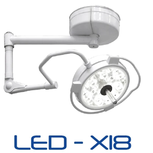 Lámpara de cirugía cialítica de 18 LEDs. Estructura metálica de anclaje al techo. Con cuerpo en acero inoxidable. Cabeza lámpara en aluminio de 40 cm. diámetro. Campo de foco a 1 metro = diámetro de 17 cm. mínimo y 25 cm. máximo. Penetración a 1 metro = profundidad de 45 cm. mínimo y 90 cm. máximo. Distancia de trabajo o profundidad de focalización de 60 cms a 1.50 m. Tarjeta de control digital microcontrolada para graduar la intensidad de luz de 40.000 lux mínimo a 80.000 lux máximo , con tres niveles de intensidad. Luz Blanca sistema LED no irradia calor. Diseño eléctrico grado hospitalario. Articulaciones sobre rodamientos con freno para los tres planos de posición